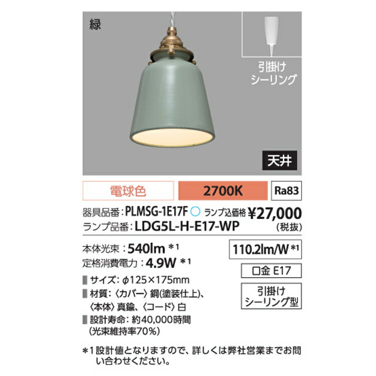 ≪器具本体≫■商品サイズ(cm)直径約12.5×高さ約17.5■口金E17■カラー白・黒・緑≪付属電球≫■全光束540lm■消費電力4.9W■商品サイズ(cm)直径約5×高さ約9.2■色温度2700K■演色性Ra83■設計寿命40000時間■口金E17■重量約52g■電源100V(50/60Hz共用)住宅向け・屋内向けのペンダントライトです。