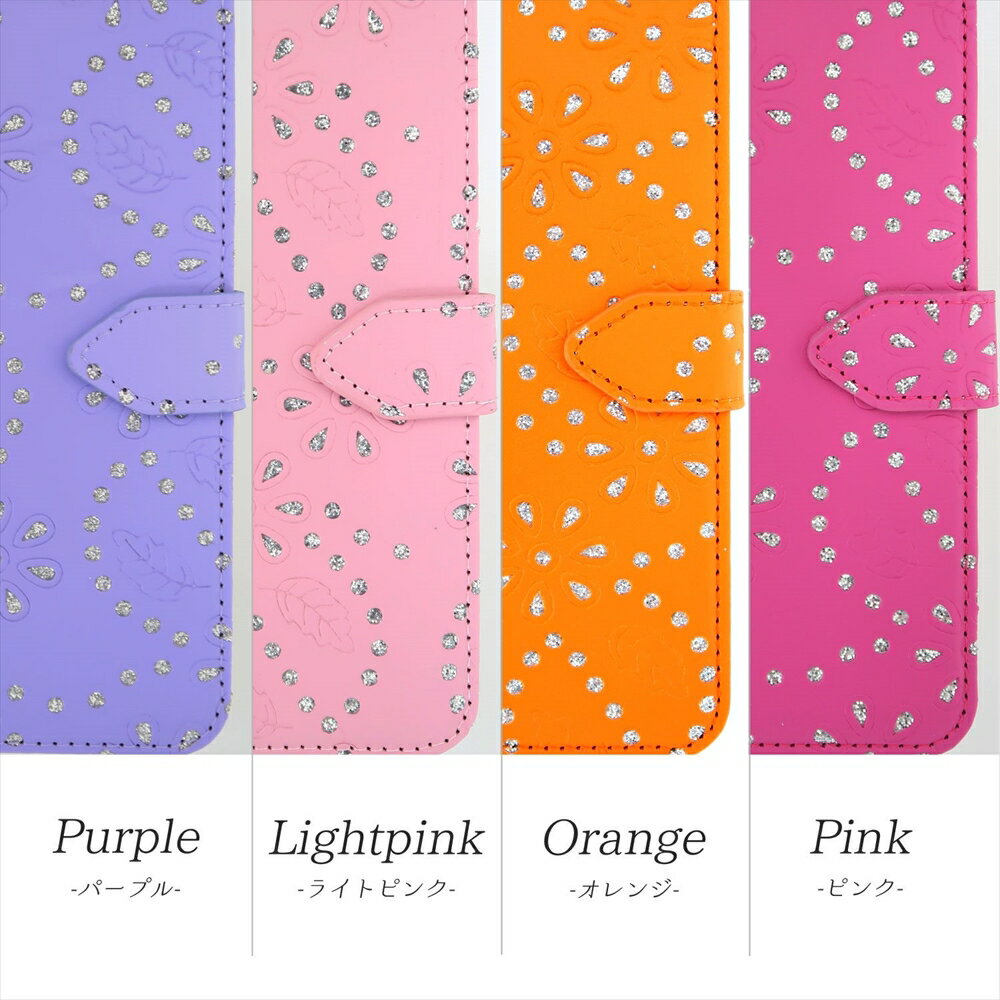 ラメフラワー生地 手帳ケース・華やかな花柄デザインの各所に無数のラメが埋め込まれており、どの角度からでも常にキラキラ光り輝くので注目度アップ間違いなし!・是非手に取って綺羅びやかなラメの輝きをご堪能下さい!・内部に備えられたインナーケースは各機種専用のポリ製ハードケースでしっかり固定し、衝撃やキズ、埃などからスマホを守ります。